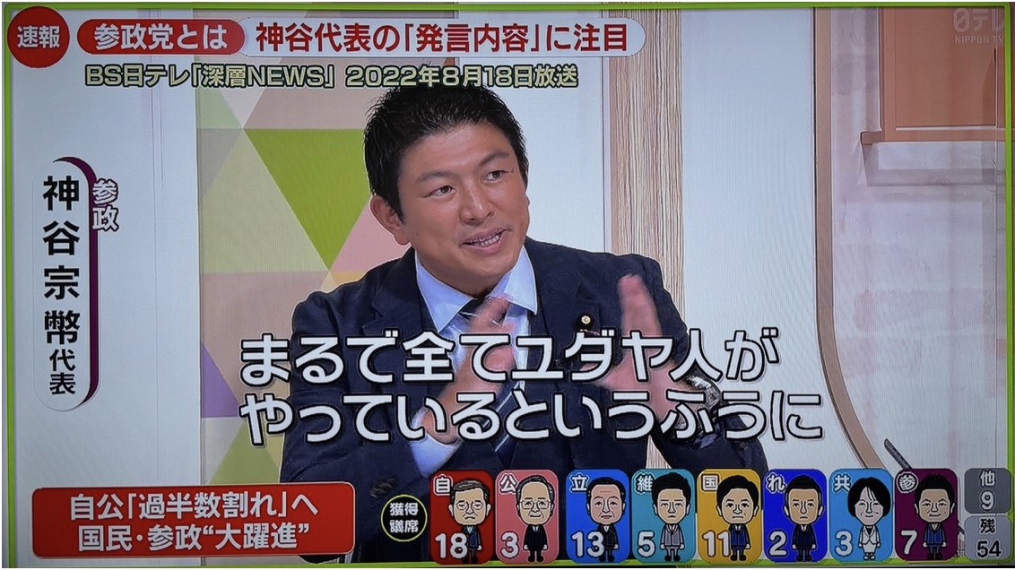 In an interview with Nippon TV on August 22, 2022, following his election to the upper house as Sanseito’s sole representative, Kamiya was asked about claims made regarding “those forces” in the Sanseito Q&A Book: Basic Edition. He responded: “It was written a bit poorly … while it’s the truth that Jewish capital is involved, I think it was a bit wrong to write it in a way that people could misunderstand as saying that all Jews are a part of it. And, so, in the future, I think we need to revise it.”