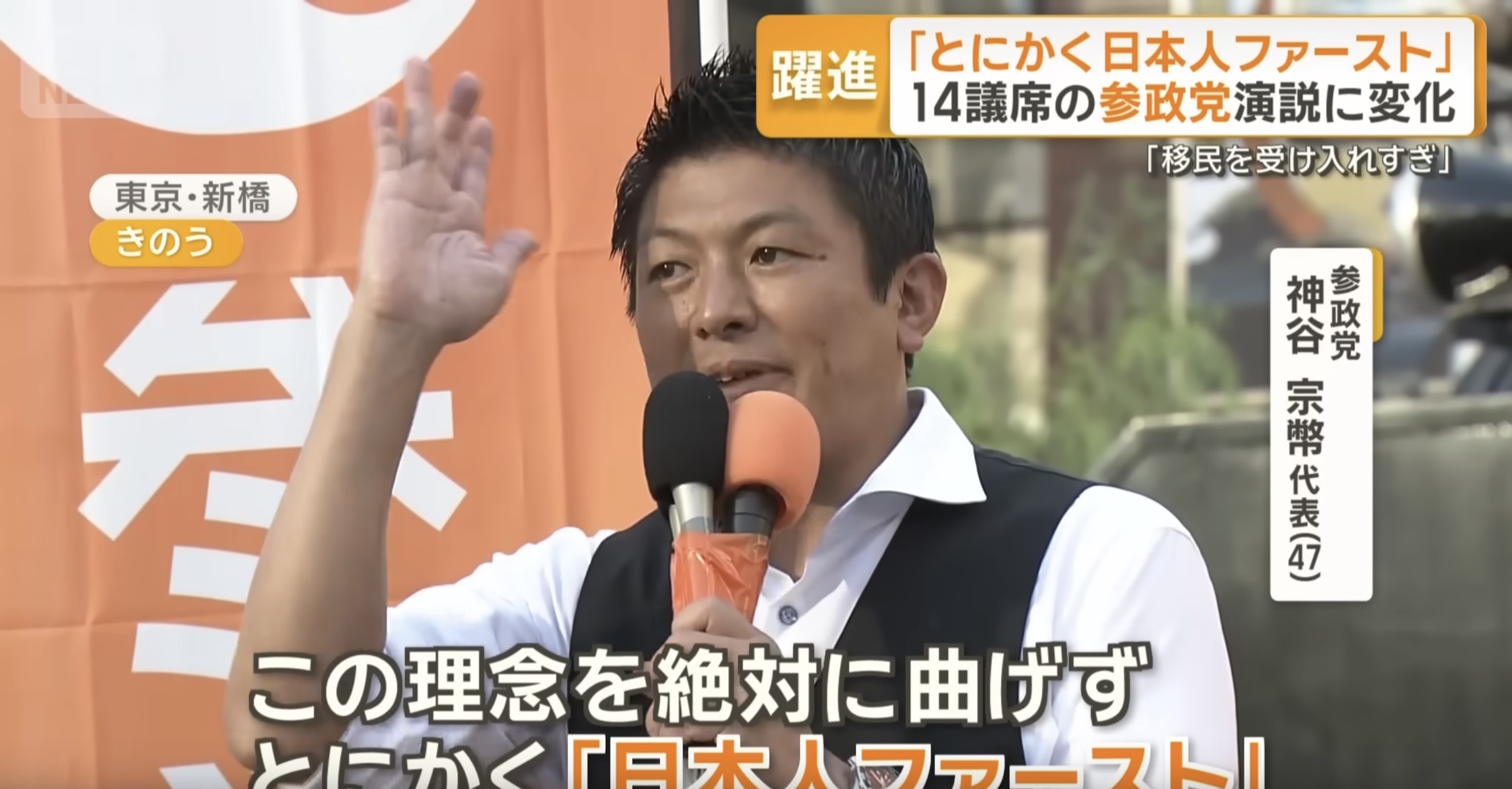 Like Sanseito’s anti-Jewish statements, this is not an anomaly, but a pattern. Kyodo News reported that during a July 15 stump speech in Tottori, Kamiya proclaimed that the Japanese government was “trying to keep the country running by injecting foreign labor and capital. It's like national doping.” Using an analogy to someone reliant on energy drinks, he was quoted as saying, “Using power from outside to run the country is heretical.” He then said, however, that the remark was just “an example”, and that arguing for restrictions on immigration was “not discrimination”.
