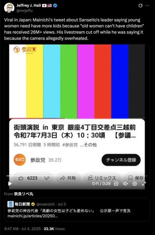 Kamiya and Sanseito officials will offer controversial political remarks only to claim plausible deniability for blatantly norm-violating comments. This occurred multiple times during the upper house campaign. On July 3, Kamiya said at campaign speech: “We were wrong up until now, such as (promoting) gender equality. Although women's participation in society is a good thing, only young women can have children … older women cannot have children.”