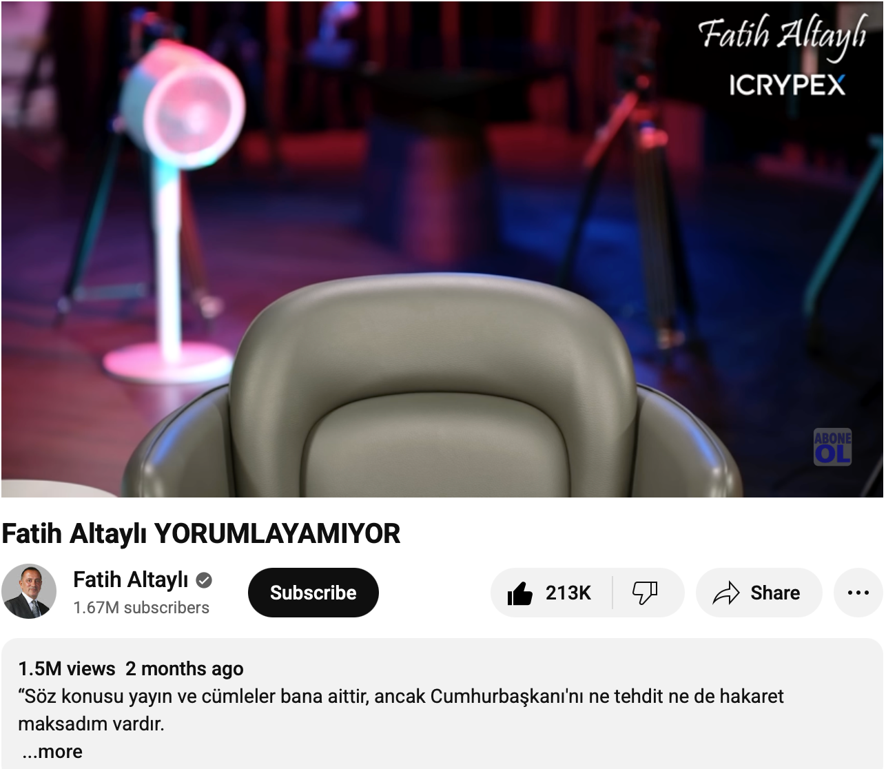 The show, “Fatih Altaylı Comments”, has over 1.6 million subscribers and is watched by more viewers than all of Turkey’s TV channels.