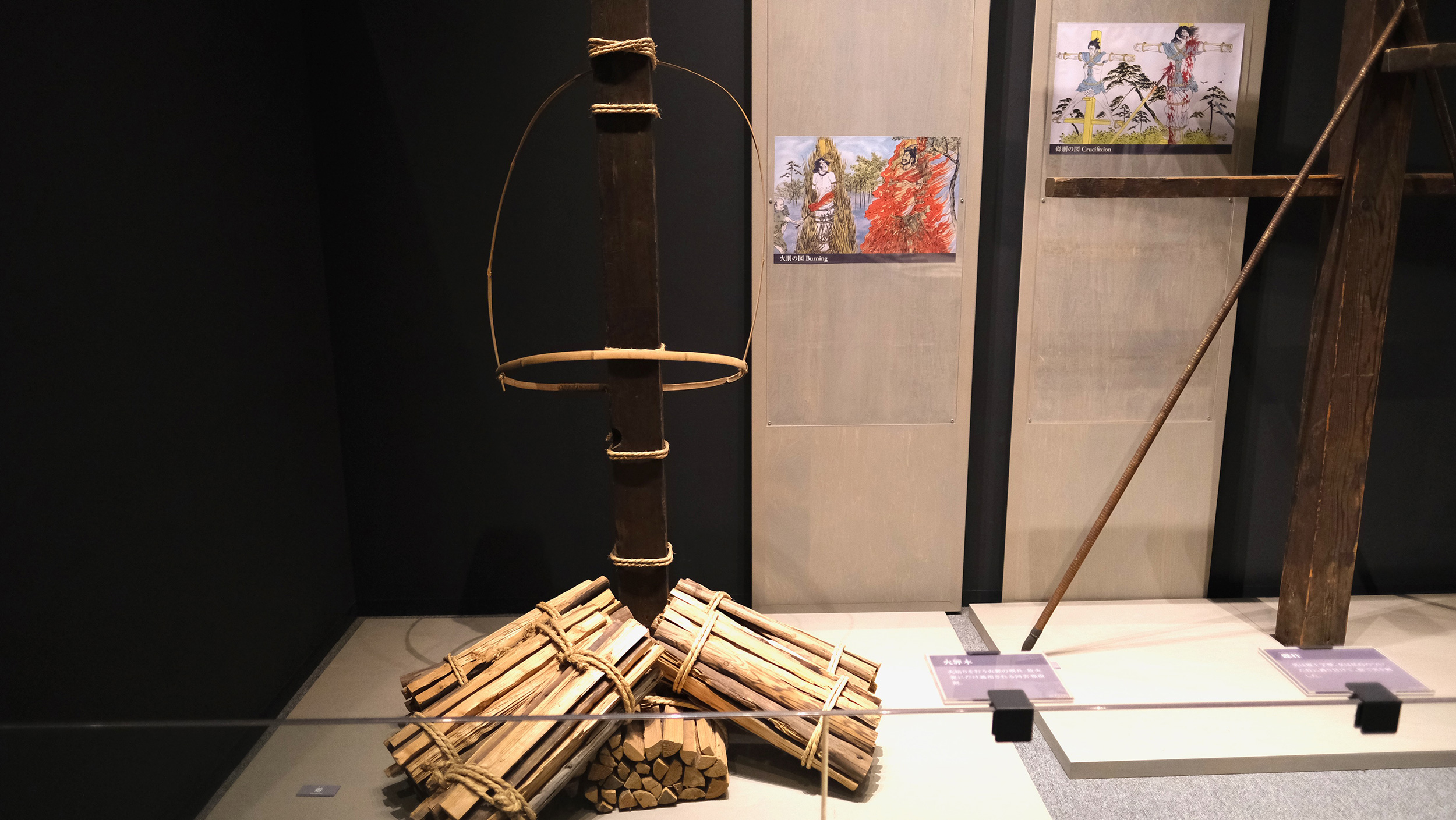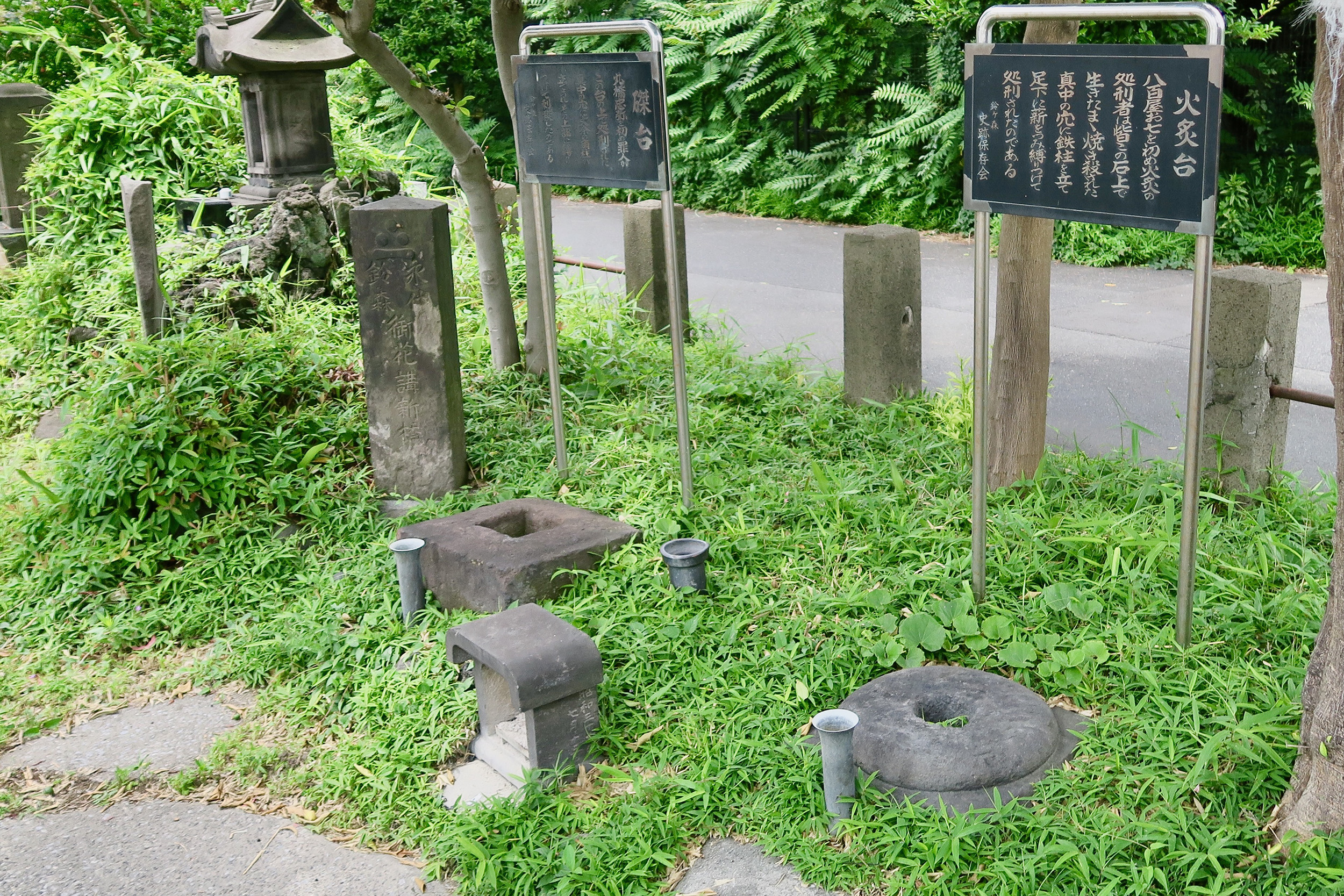 The site, well maintained by the neighboring Daikyoji temple, is identified by signs as a historic landmark. Among the relics on display are two square stone slabs, measuring slightly less than one meter on each side. The one on the right has a circular hole to support a wooden post used for hi-aburi (burning at the stake). Its companion has a square hole, which supported the crossbeams used for haritsuke, a gory form of execution involving perforation with spears.