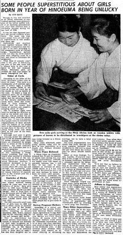 I had picked up the January 1 edition of the Japan Times, which was already on sale on the base, and on page 10 spotted the headline: "Some people superstitious about girls born in year of Hinoeuma being unlucky."