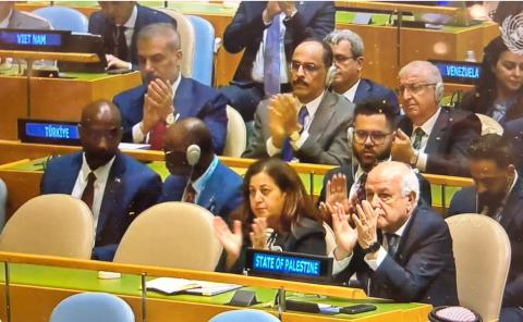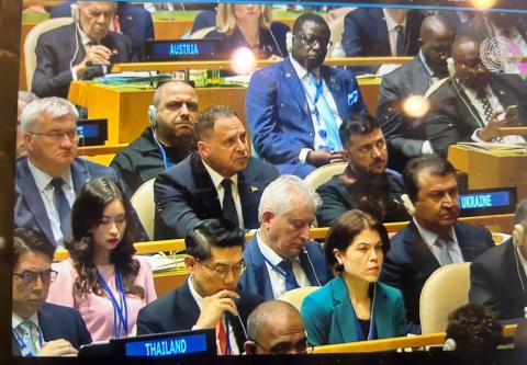 Palestinian Permanent Observer to the United Nations Riyad Mansour reacting to a speech recognizing the State of Palestine during the United Nations General Assembly in New York City on September 23rd. (Credit: Ilgin Yorulmaz via UN TV)