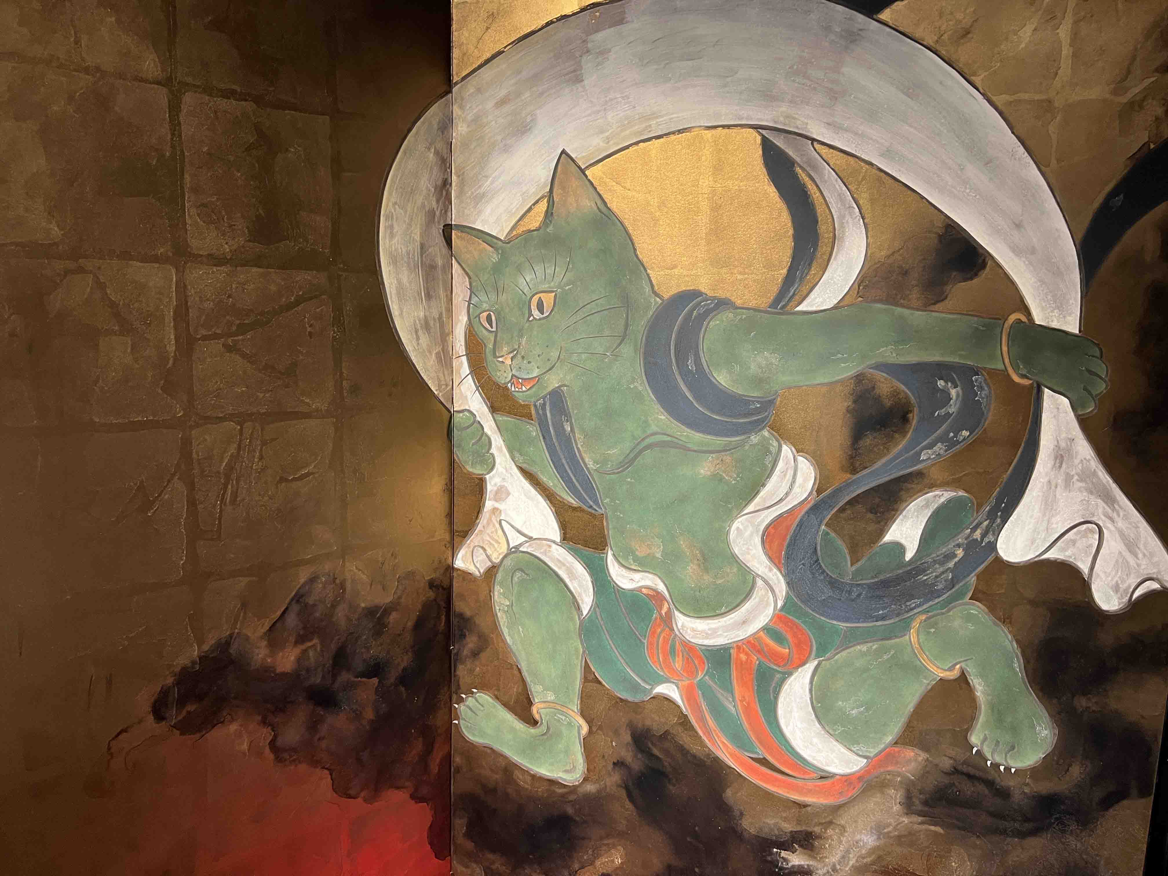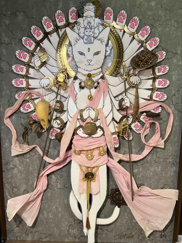 A striking ornamented painting of a kittenish Kannon, the Goddess of Mercy.