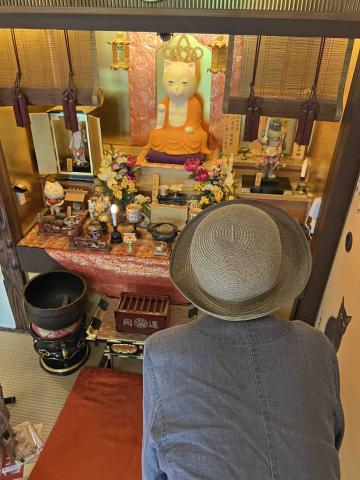 A supplicant praying before a cat altar in the Nyan Nyan-ji temple.