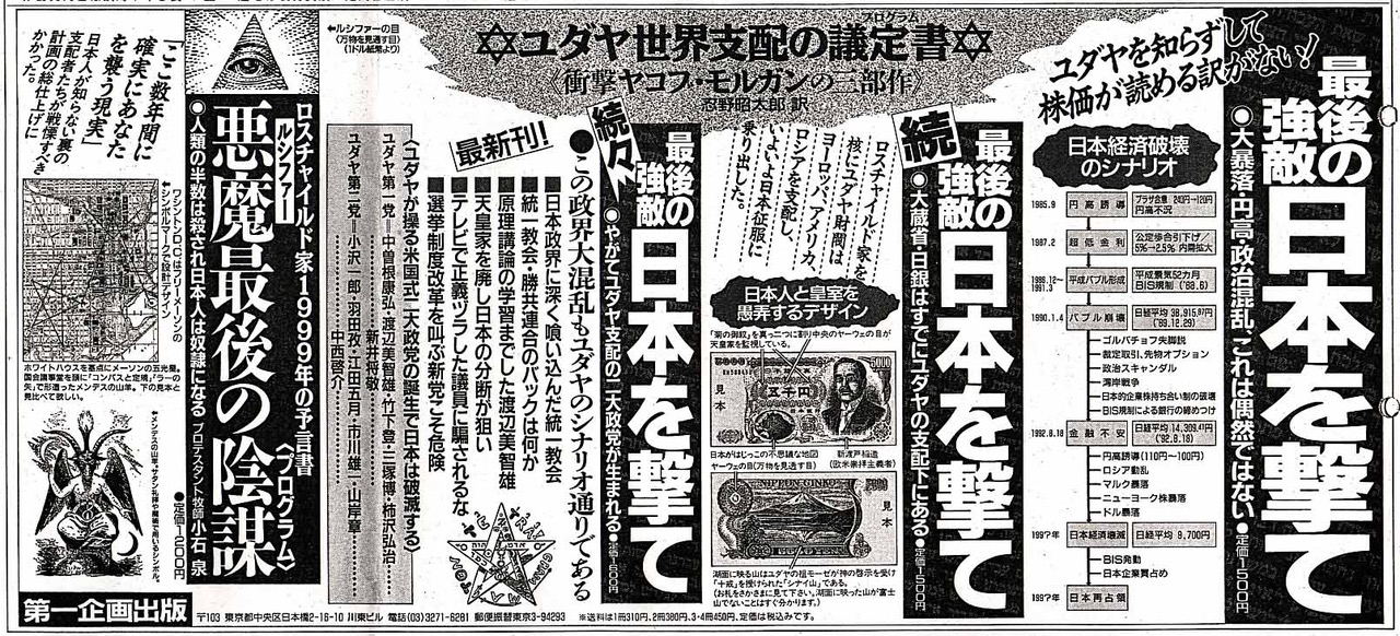 The tract's contents were basically a rehash of materials that could be found in any large bookstore. Books about Jews had been popular in Japan even before the beginning of the economic bubble in the 1980s, but seeking to make sense of the economic upheaval, a proliferation of new titles attributing Japan's skewed economy to the machinations of the Elders of Zion – by authors like by Ryu Ota and Masami Uno – had appeared. Some of the most bizarre, like the pseudonymous Jacob Morgan's Strike Japan! trilogy, were even advertised in national newspapers.