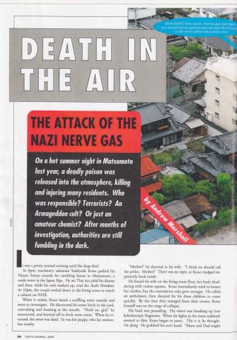 The foreign press corps in search of the sarin link were just as dazed and confused as their Japanese counterparts. But Tokyo Journal, the monthly English city magazine, deserves recognition for a seven-page story in its April 1995 issue titled "Death in the Air: The attack of the Nazi nerve gas" by Andrew Marshall.