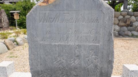 Under the militarist regime, this tombstone was erected in the vast cemetery of Munekazu's father, Tachibana Sozaburo, at Kakuozan Nittaiji Temple. Half a century since then, a housewife out for a walk discovered the tombstone buried in the grass and reported it to a newspaper, bringing it to the public's attention. In 1975, a group of volunteers established the Tachibana Munekazu Gravestone Preservation Society, and since then, they have held annual graveside services at the site. The decision was made to relocate the tombstone to Akitake (Ama City), Sozaburo's hometown. In memory of Munekazu's death, the tombstone will be preserved here forever to prevent such a tragedy from ever happening again. 2023 (Reiwa 5) Tachibana Yukinori