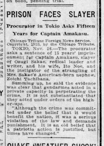 A United Press dispatch under the byline of Clarence Dubose, dated December 12, 1923, reported that "Relatives of Sakae Osugi, the famous Japanese radical, who, with members of his family were murdered by military police after the earthquake, have sued the government for $50,000 in damages.”