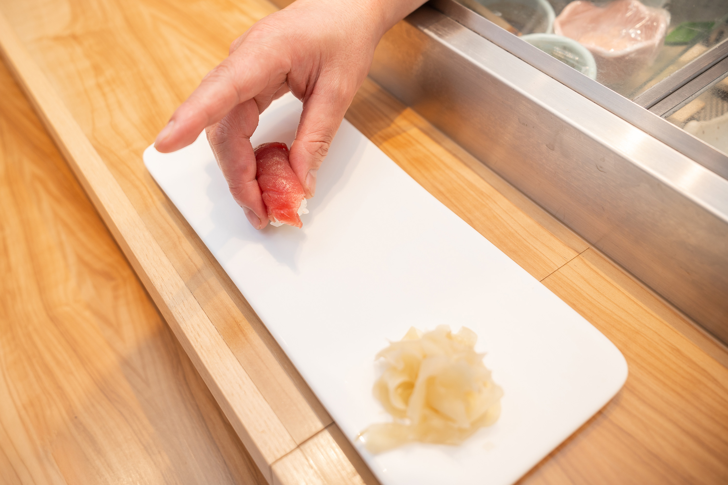Eating is a ritual in its own right. The fish is sliced with great precision, and the sushi is placed either on a small wooden board, known as a geta, or directly on the diner’s plate at the counter. Serving is done one piece at a time, according to a fixed and carefully considered sequence. Unlike many restaurants in Japan, there is no set meal served all at once. Instead, diners receive a succession of pairs of nigiri, offered at a relaxed pace that allows the experience to unfold over one to two hours. It is customary to begin with white fish and delicate flavors, then gradually move on to fattier fish with reddish or brown hues, followed by shrimp, octopus, and squid, and to conclude with sushi topped with omelet, tamagoyaki, or, heaven forbid, even a simple makizushi.