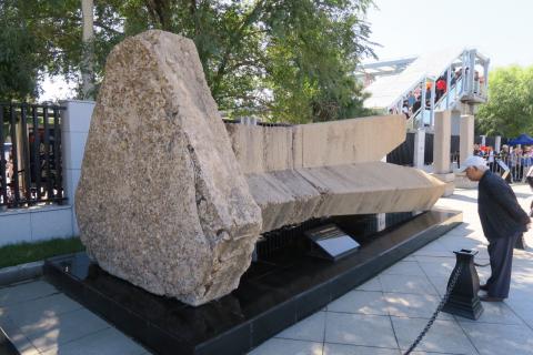 Turned on its side to symbolize defeat, the same marker on display outside the September 18th Museum.
