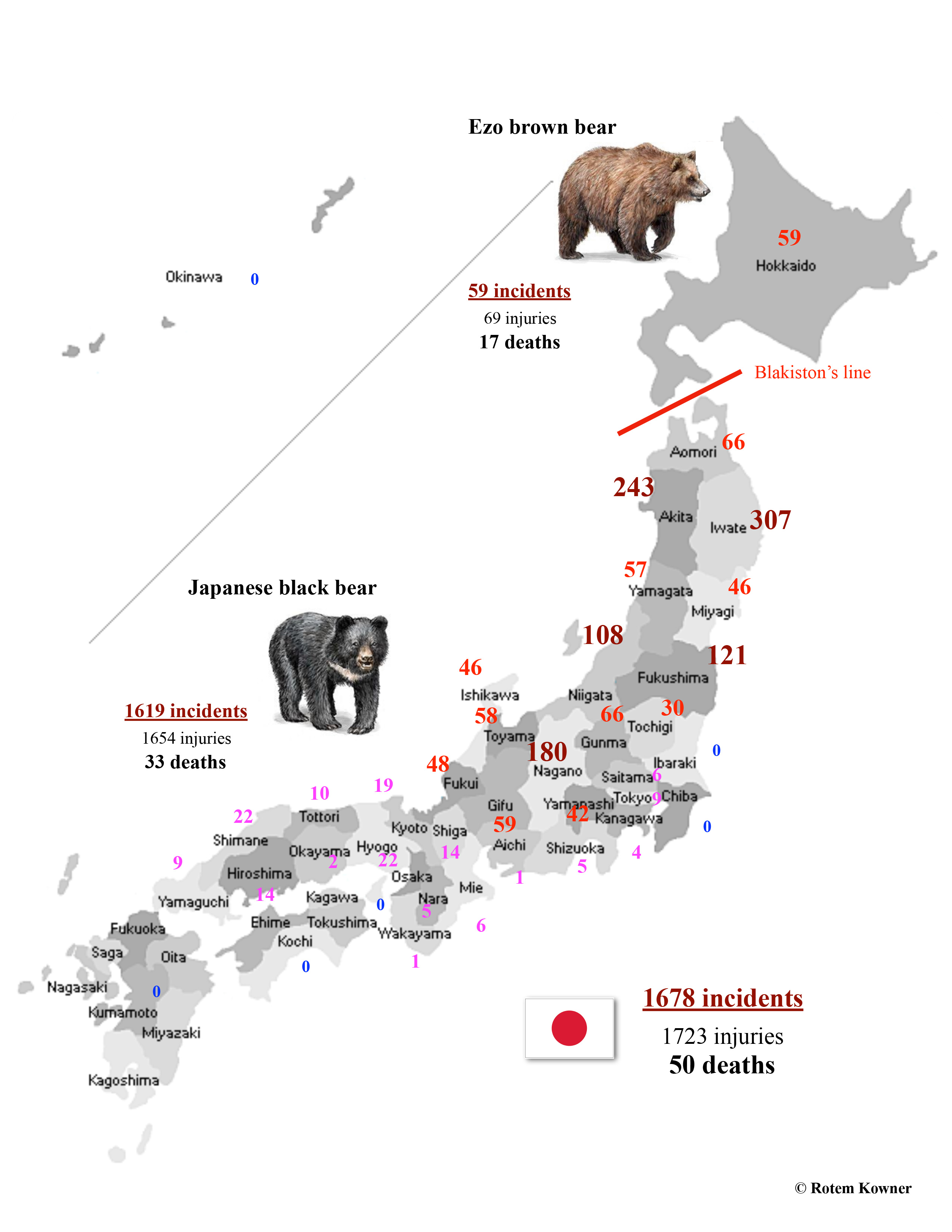 The geographic division into two species of bears and their distinct patterns of aggression strongly shape the geographic distribution of attacks in Japan. Over the past 18 years, the seven prefectures with the highest numbers of attacks and resulting injuries, all involving black bear, have been Iwate, Akita, Nagano, Fukushima, Niigata, Aomori, and Gunma. Concentrated either in the remote Tohoku region of northeast Honshu or the mountainous areas northwest of Tokyo, these prefectures alone account for no less than 64.5% of all recorded attacks. Hokkaido, by contrast, ranks only ninth in total attacks and injuries but, as expected, first in fatalities, with 17 deaths caused exclusively by brown bears (and 50 since 1962) – more than double the toll in the second-highest prefecture, Akita, which recorded eight. Black bears have on occasion attacked people even in urbanized prefectures such as Kyoto and Tokyo, though such incidents remain rare in cultivated lowland plains where bears cannot easily hide. No attacks, however, have been recorded in the islands of Kyushu, Shikoku, and Okinawa, nor in Honshu’s densely populated and relatively flat prefectures of Osaka, Chiba, and Ibaraki.